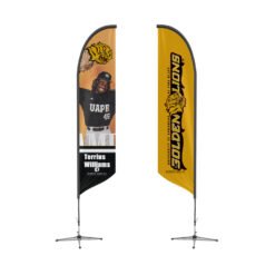 Las banderas de plumas personalizadas son un tipo de bandera publicitaria, con forma de pluma, que las empresas suelen utilizar para llamar la atención sobre su ubicación o evento. Son personalizables, lo que permite diseños, logotipos y mensajes personalizados.