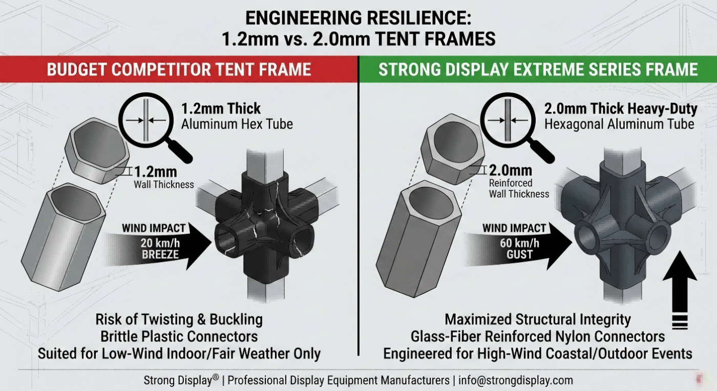 This means if the wind speed doubles, the force hitting your tent quadruples. A standard 1.2mm wall thickness frame might handle a breeze, but at Strong Display, we utilize 2.0mm heavy-duty hexagonal aluminum. That extra 0.8mm isn’t just weight—it’s a massive leap in structural integrity that prevents the frame from “twisting” under torque.