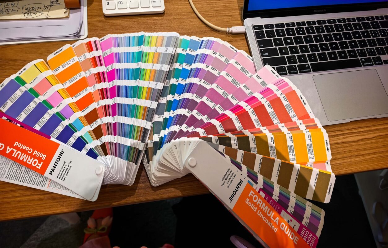 We provide visual aids, such as physical PMS swatch books, to help clients accurately identify and confirm their desired colors. We explain the difference between spot colors (PMS) and process colors (CMYK), and how digital (RGB) colors are rendered.