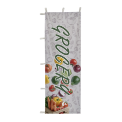 Welcome your customers to a world of freshness with the “Custom Grocery Nobori Flag,” a vibrant display that’s ripe with appeal. Bursting with colorful imagery of fresh fruits and vegetables, this flag is a cornucopia of visual flavor that promises quality and nourishment.