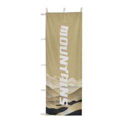 This custom Nobori flag features an evocative mountain design, seamlessly combining natural elements with your brand’s message for a powerful visual impact. The earth-toned backdrop and undulating patterns embody a spirit of adventure and resilience, perfect for outdoor brands or events. Displayed on a sturdy pole, it’s designed to stand tall and catch the eye, whether used at storefronts, trade shows, or outdoor exhibitions.